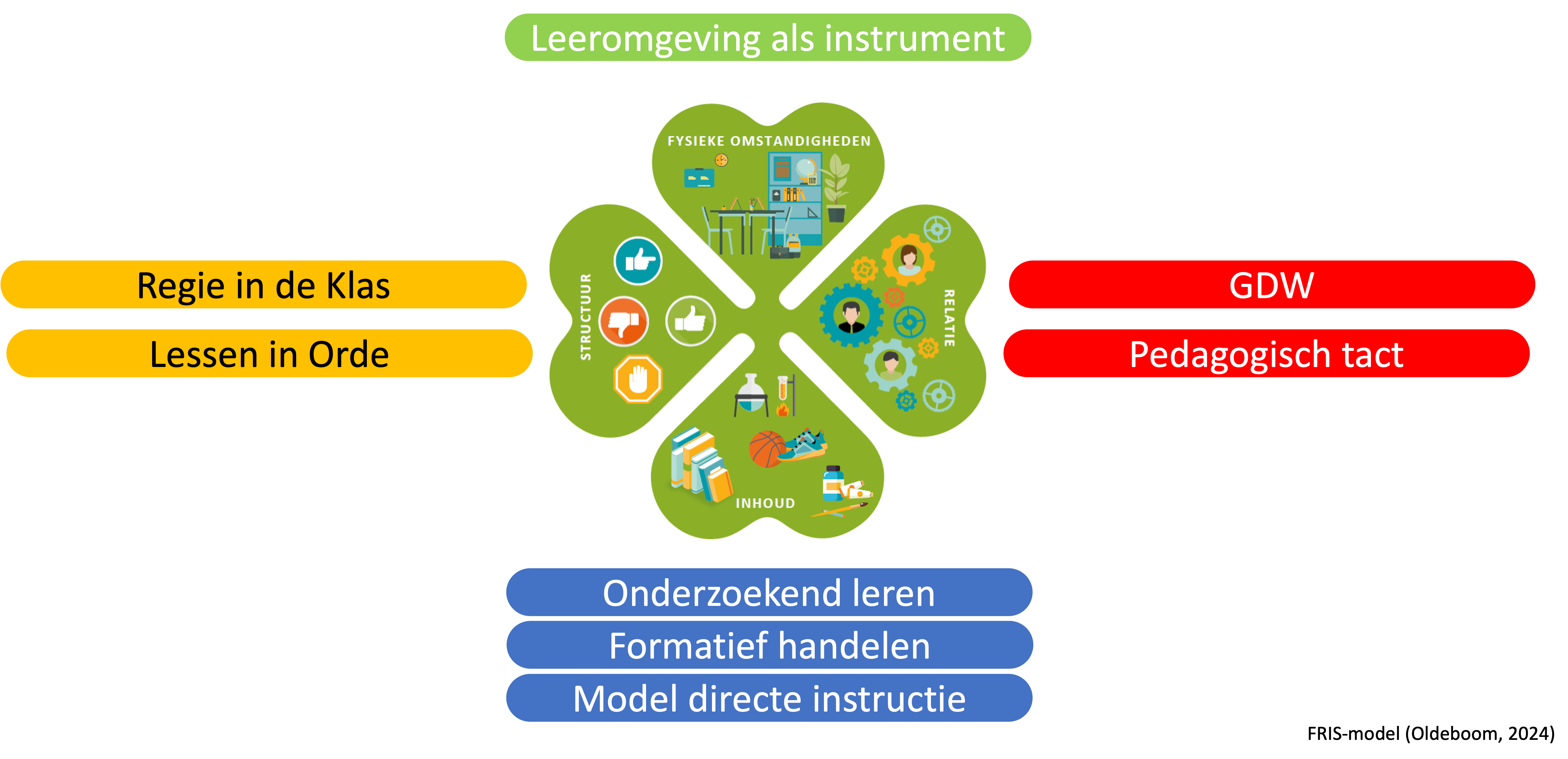Tijdens mijn promotieonderzoek ontdekte ik op basis van een uitgebreide literatuurstudie het didactisch klaverblad. Het didactisch klaverblad is een model dat laat zien dat leraren aandacht geven aan vier basiskenmerken van een les voor een veilig en uitdagend leerklimaat: Fysieke factoren, Relatie, Inhoud en Structuur (FRIS). De les is altijd ergens (fysiek), met contact tussen een leraar en leerlingen (relatie), over een onderwerp (inhoud), en georganiseerd met afspraken (structuur).