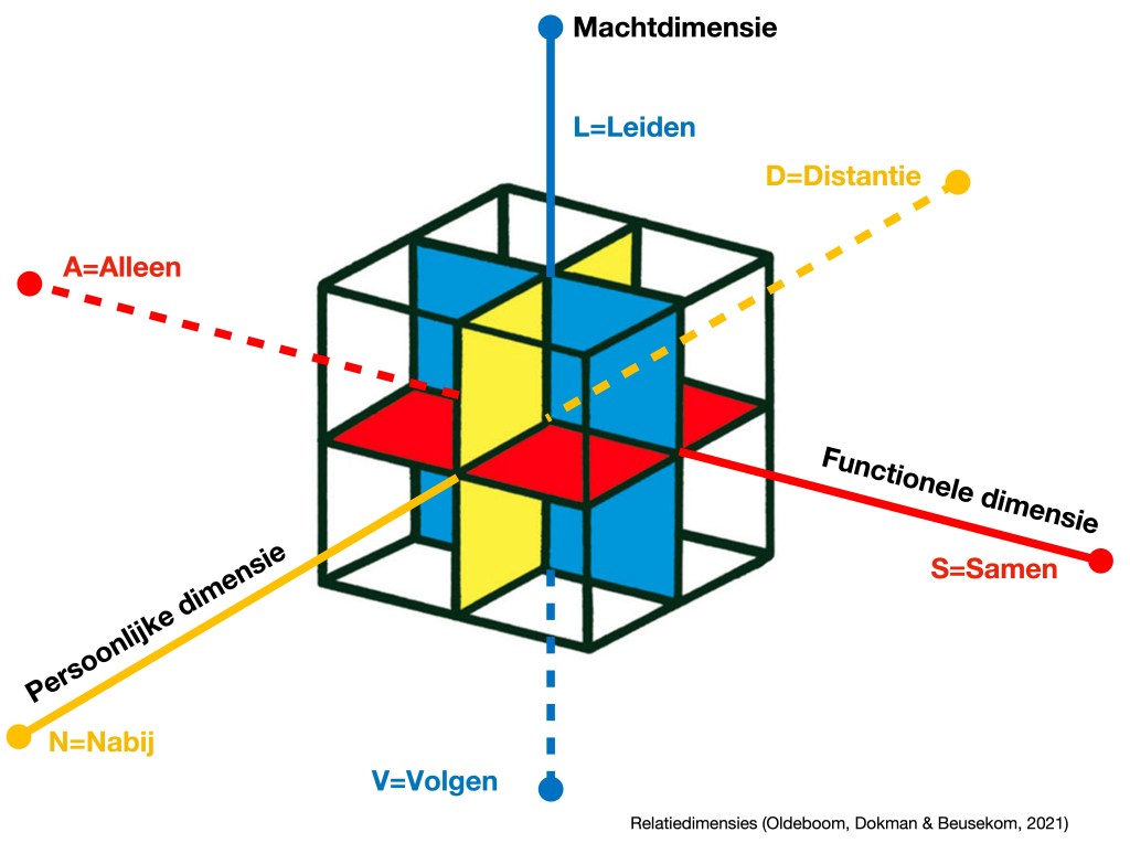 Het hierboven weergegeven schema is te zien als de opvolger van de Roos van Leary. De assen ‘boven – onder’ (Dominance) en ‘samen – alleen’ (Cooperation) zijn er nog steeds. De persoonlijke dimensie is hieraan toegevoegd. Op deze manier ontstaan er 8 vakken. Deze drie relatiedimensies maken het gesprek over de wijze waarop docenten vormgeven aan de relatie misschien meer complex. Daartegenover staat dat de nuances gemakkelijker aan de orde kunnen komen…